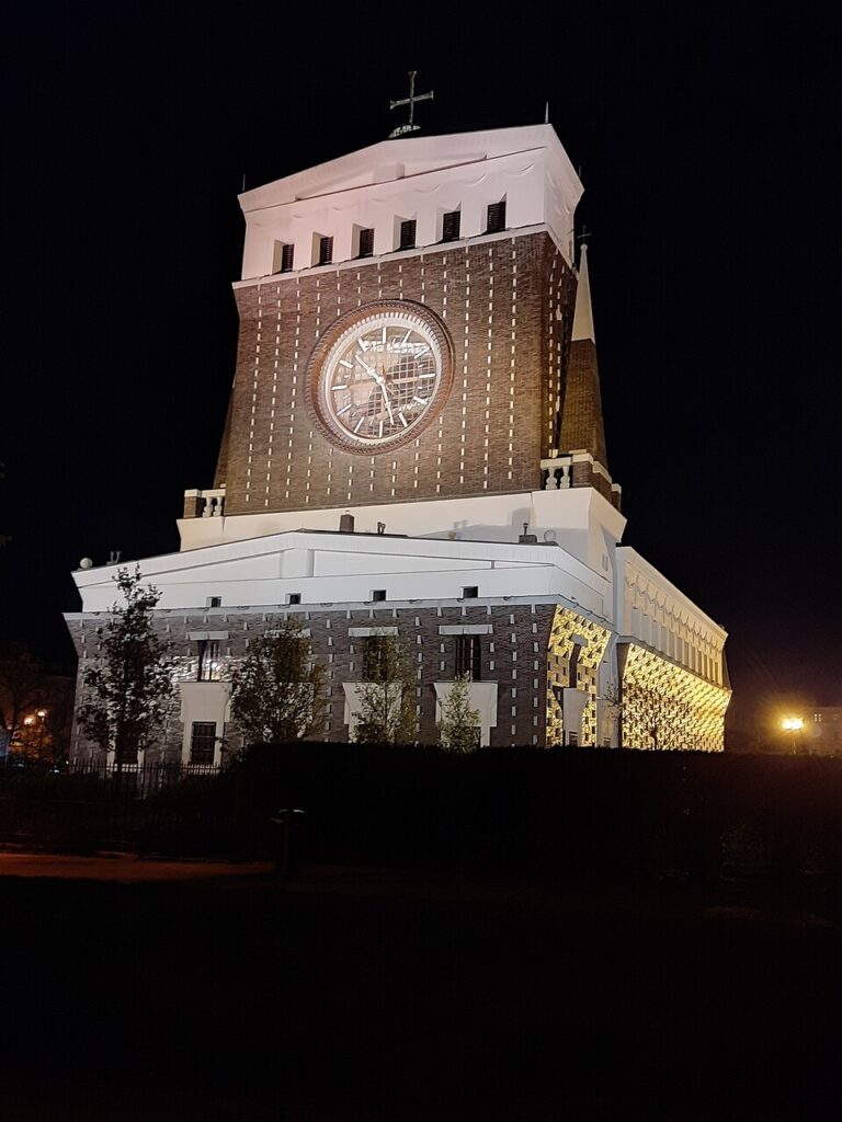 Hodiny monumentálního modernistického kostela Nejsvětějšího srdce Páně v Praze na Vinohradech jsou s průměrem 7,6 metru největší v naší zemi